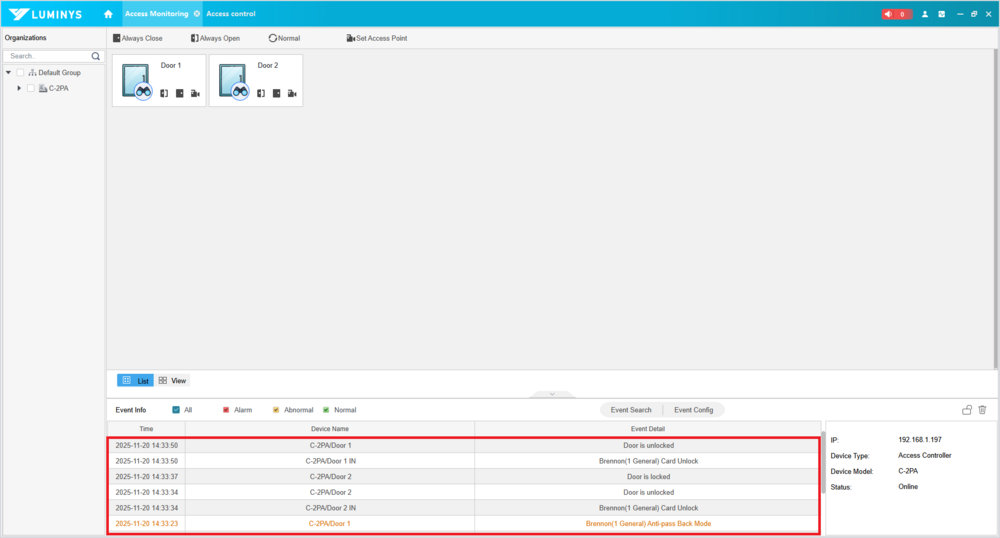 This tutorial will cover how to set up Anti-Pass Back rules for Luminys access controllers via LumiViewer. Anti-Pass Back ensures that an "Out" door has been scanned before the "In" door can be scanned again, preventing persons from "passing back" cards or authentication devices to others for use.