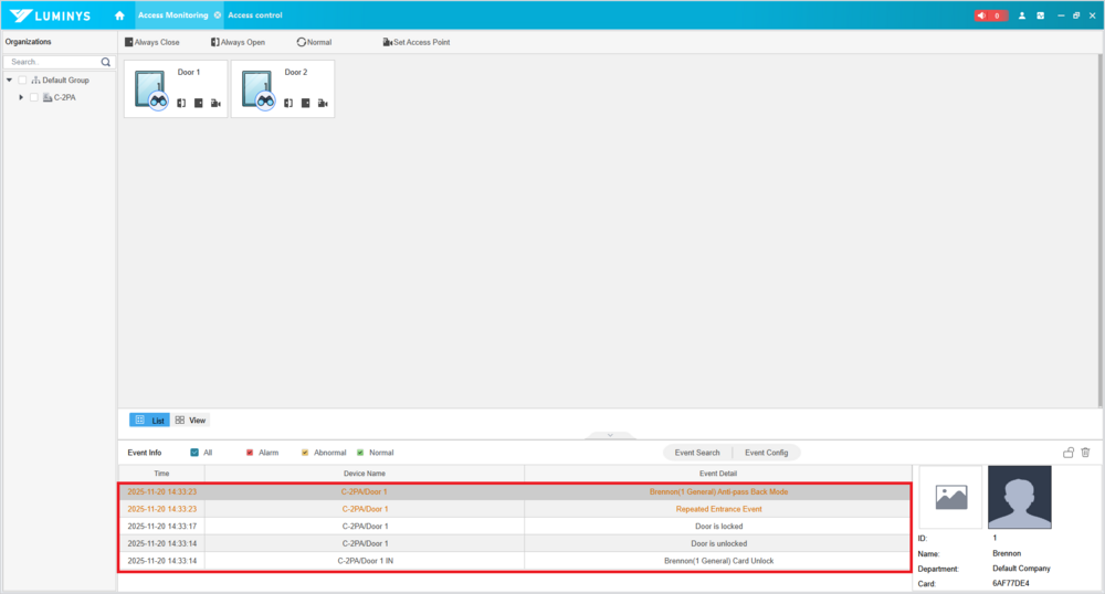 6. In access Monitoring we can now see if a user tries to scan the same entry door (Door 1) twice in a row, the rule kicks in and denies entry. If the user then scans an exit door (Door 2), they are then able to authenticate the entry door again.