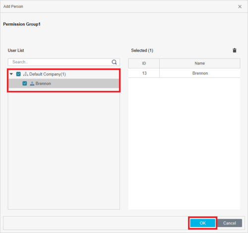 9. After we have set the basic permissions, select the people that will have access to the defined doors during the selected time frame, and click OK. Note that at this time, LumiViewer does not support department-wide permissions. Each user needs to be added manually, which means users created after the rule need to be manually added to the rule.