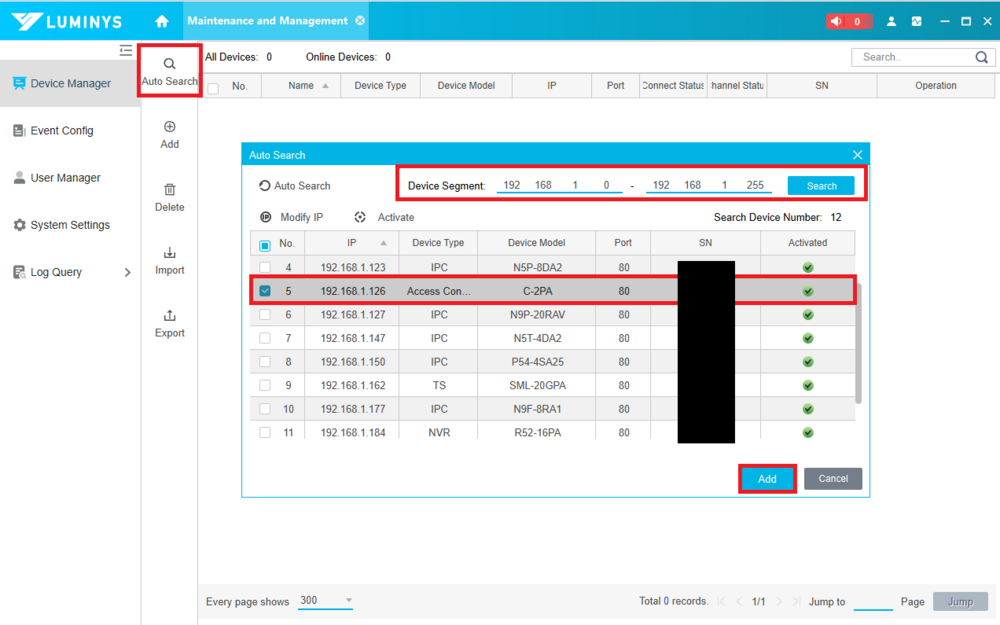 2. Click Auto Search to scan your local network for available devices. Be sure to set the appropriate IP range if it is not the same as your PC, and click Search. Once you've located your controller, check the box for it and click Add.