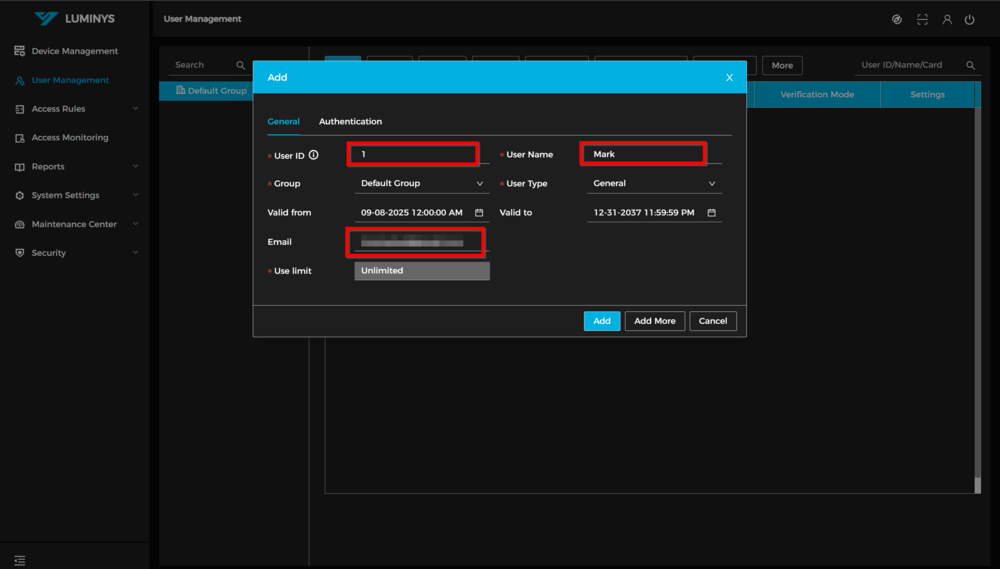 12. Once the add window appears, you will want to fill in the User ID with a number, a username and importantly an email address. The email address that you are adding needs to be associated with a LumiViewer Mobile account as you will see later that after you add a Bluetooth card it will automatically appear on your app. Next we will click the authentication tab to add the card.