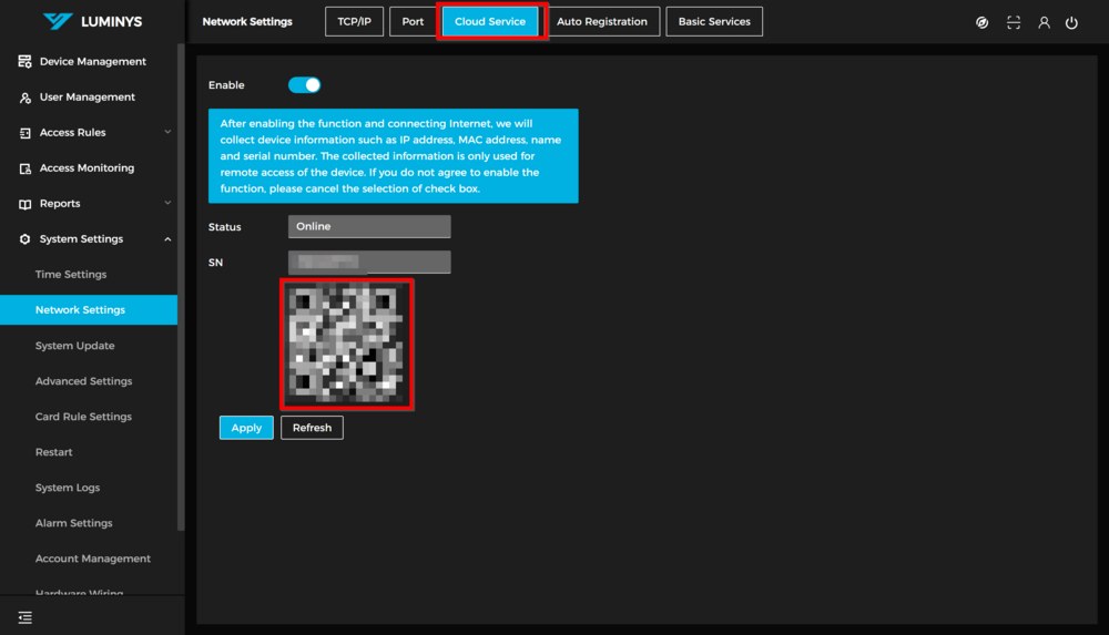 2. Once on the network settings page, select the cloud service option along the top. You will want to make sure this is enabled and that it shows online. Then you will use your phone with LumiViewer mobile to scan the QR code to add the device into LumiViewer.