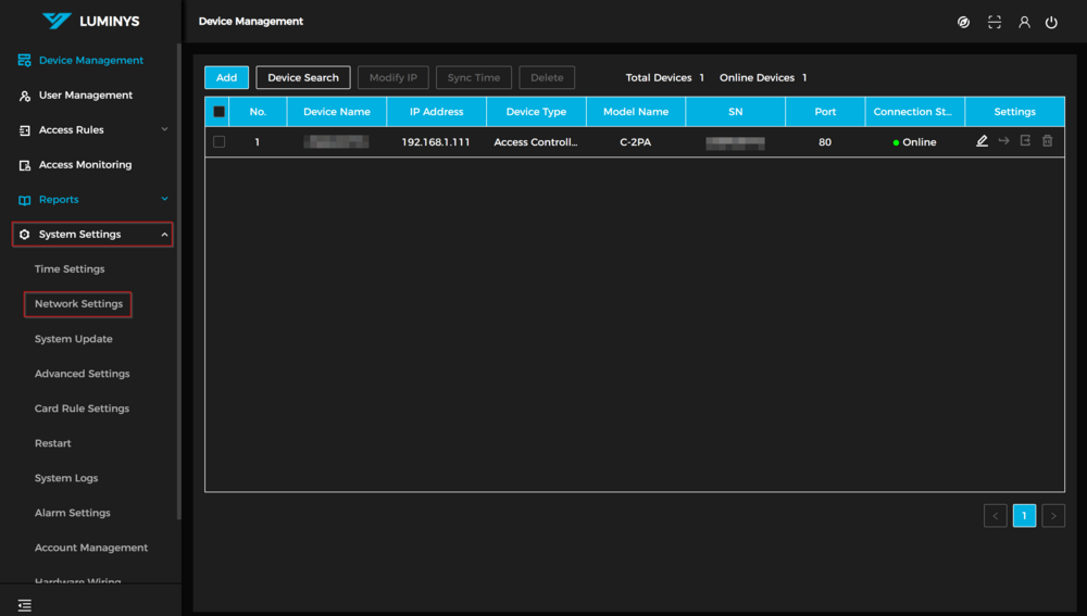 1. The first step to start the process would be to log into the WebUI of the access controller. The first thing we will need to do before we can start using Bluetooth cards is to add the access controller into LumiViewer mobile to register it. Anyone can add it to their phone but ideally the main person who manages the device will add it. Once added onto LumiViewer mobile by one person no one else needs to add it. To start this process go to System Settings on the left, then select Network Settings.