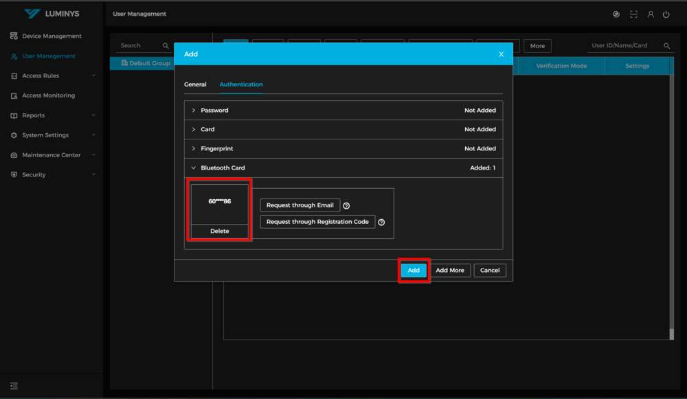 14. If everything was set up correctly, after clicking the request through email option you should see a Bluetooth card added to the left of the request through email option. Once that appears you can click add to finalize adding the user.