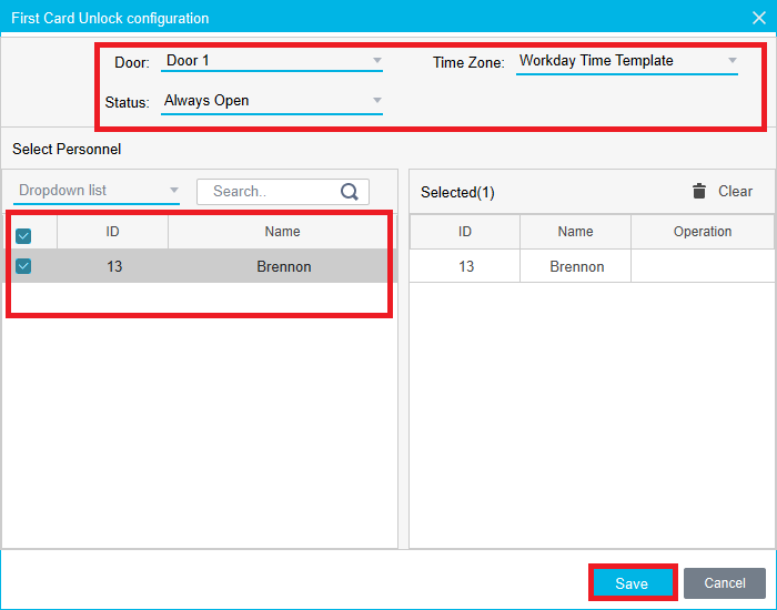 3. Select the door you want the rule to apply to, as well as the Time Zone (schedule) you want the rule to follow, and the status you need to door to change to. Check the box for the desired personnel that can activate the First Card Unlock, and click Save.