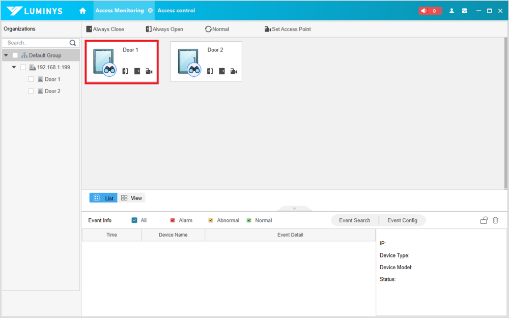 5. To illustrate, we can look at the Access Monitoring window to see the door currently has a locked status (Normal).