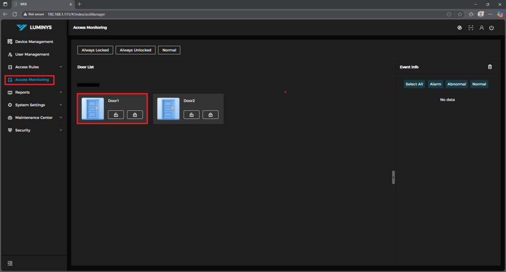 6. To demonstrate, you can see here in Access Monitoring that this door is currently closed (using a Normal status). Our First Person Unlock is scheduled Monday to Friday, 07:30-18:00.