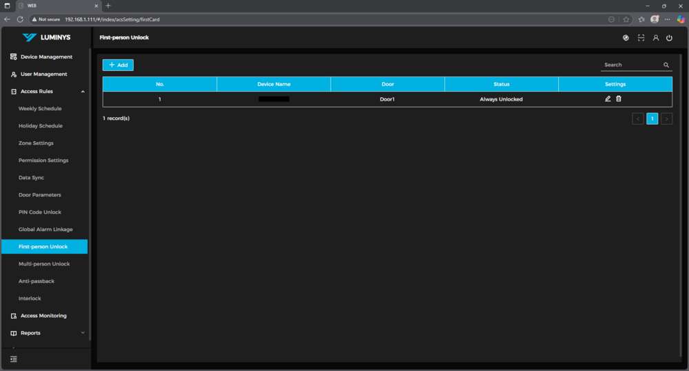 1. Start by logging in to the WebUI for the controller, and browse to Access Rules on the left, and select First-Person Unlock. From here, click Add.