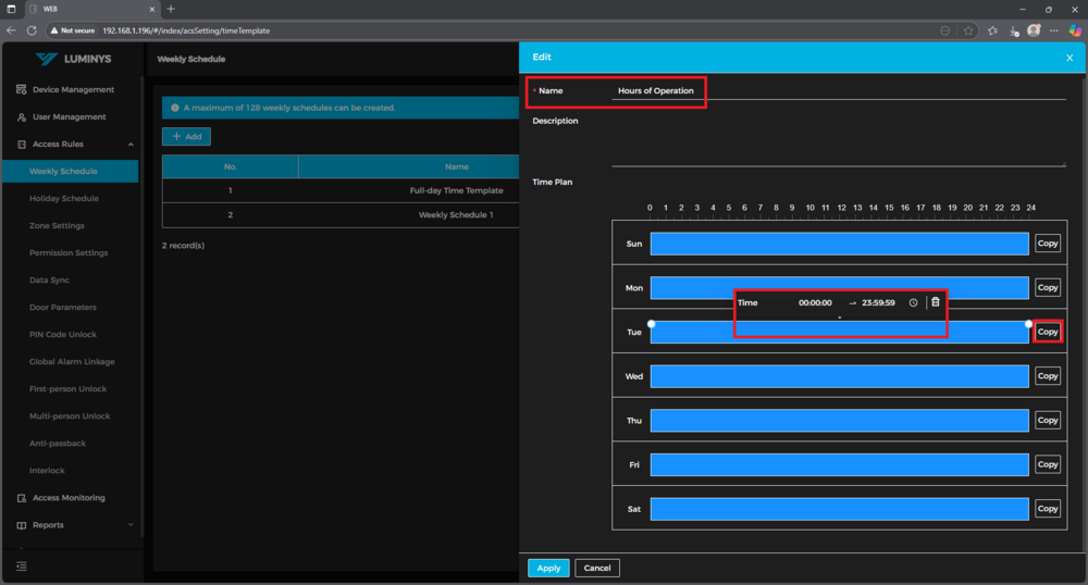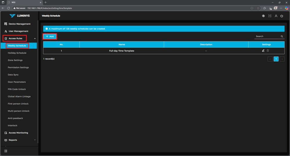 This guide covers how to create or modify Weekly Schedules via Luminys Access Control systems WebUI.