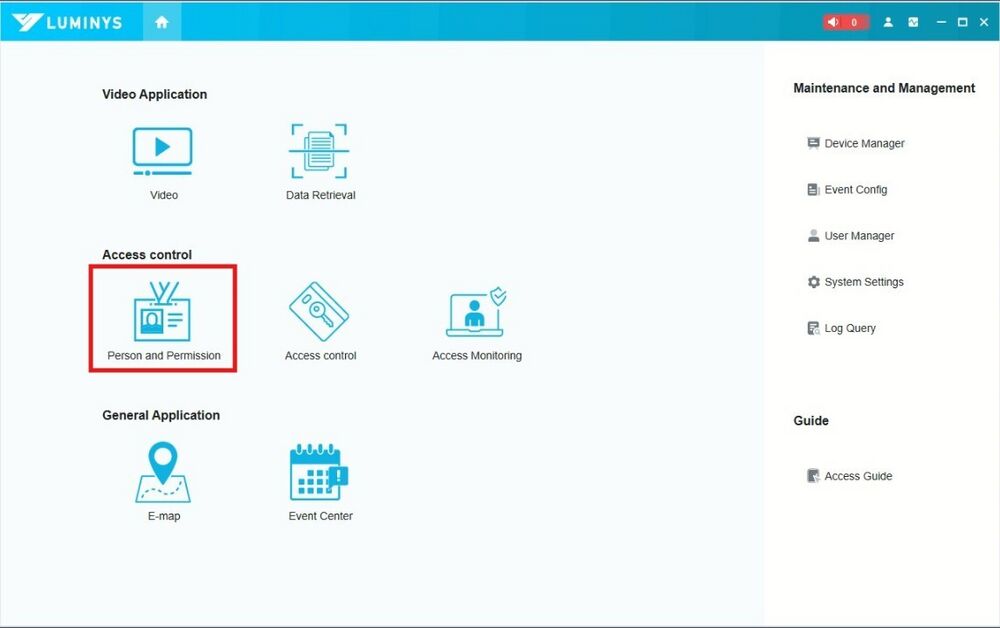 1. Start by opening LumiViewer. From the Home tab, select Person and Permission under the Access Control header.
