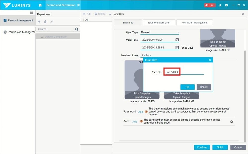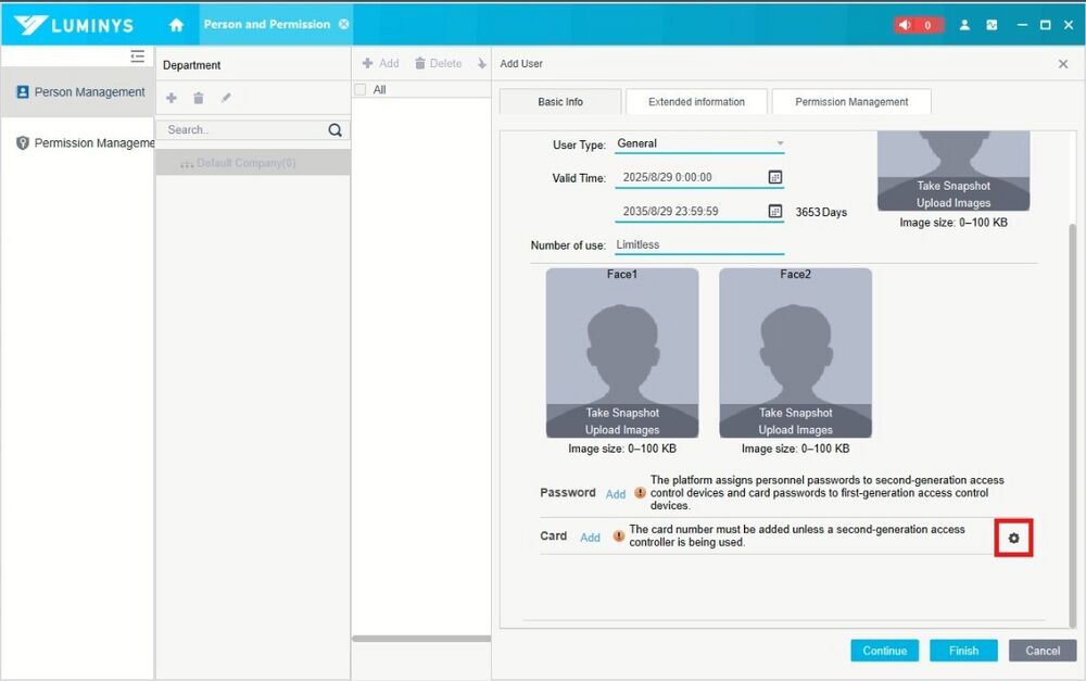 8. Once completed, you should see the card details registered to the Person. You can click Finish to complete editing an existing Person or when you are done creating one, or you can click Continue to move on to creating the next Person.