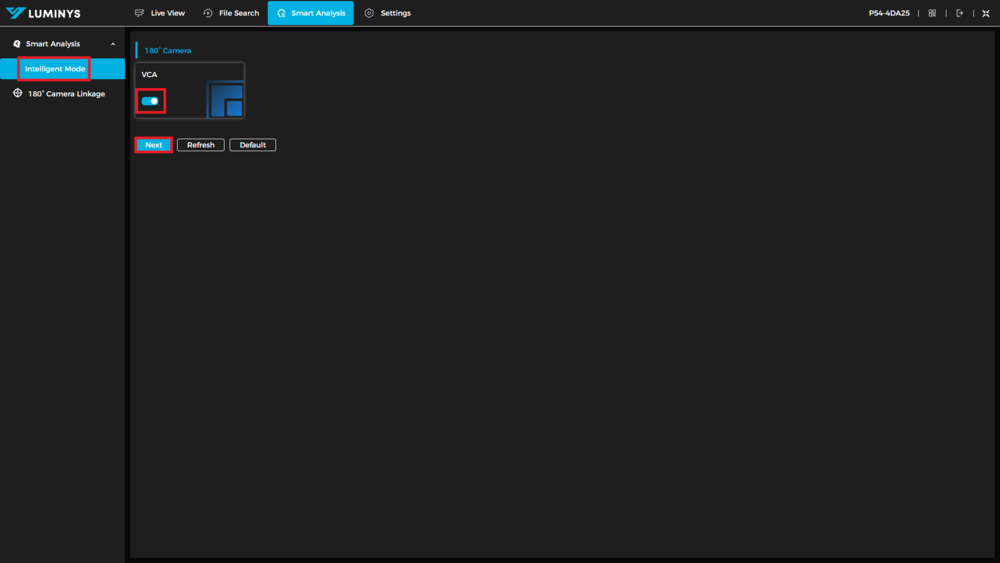 2. Next, select Intelligent Mode on the left, enable VCA for the 180° camera, and click Next.