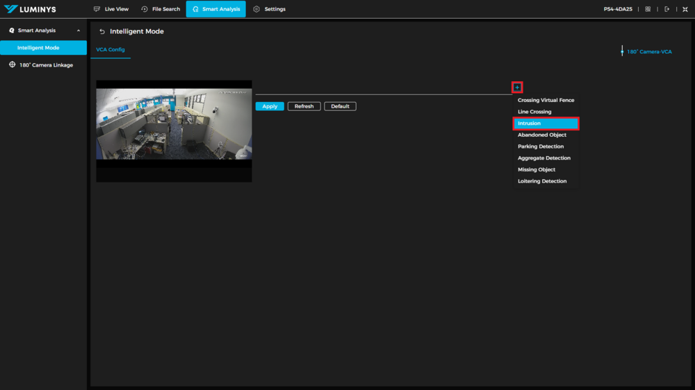3. Click the + icon and select the type of VCA rule you want to create. For the purpose of this guide, we are going to use Intrusion.