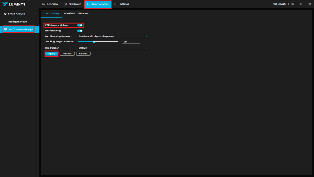 1. Start by logging in to the cameras WebUI, and selecting Smart Analysis at the top. Select the 180° Camera Linkage option on on the left and enable PTZ Camera Linkage. You may want to change the tracking duration or the target ratio. By default the PTZ will zoom to a 40% ratio (target to frame), but can be increased or decreased as needed. Once your settings are configured, click Apply.