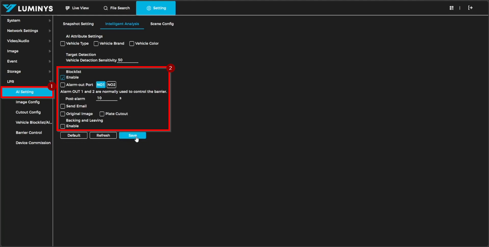 14. For blocklist configuration, navigate to AI Setting. Note that if NO1 is assigned under Barrier Control, only NO2 can be used for the blocklist in AI Setting, and vice versa.