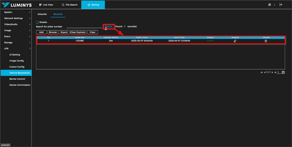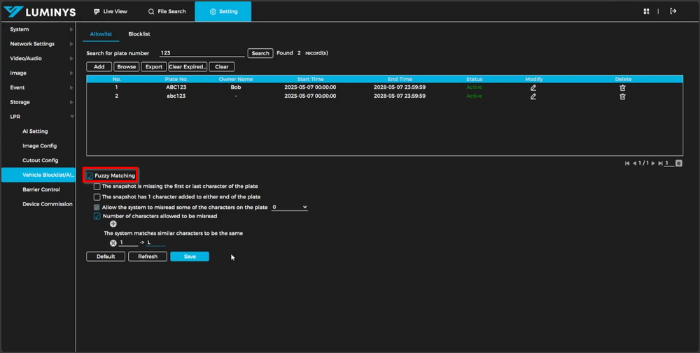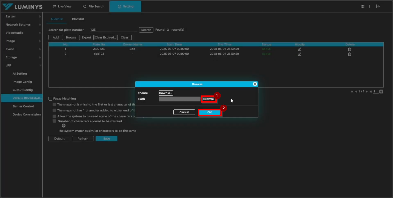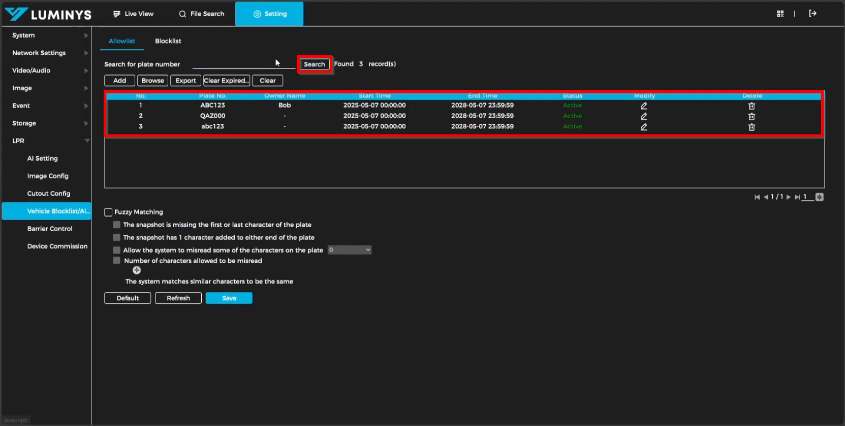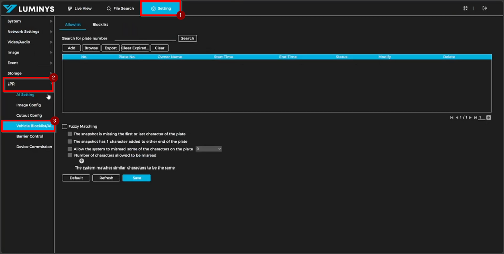 1. Navigate to Setting > LPR > Vehicle Blocklist/Allowlist to access the allowlist and blocklist configuration options.