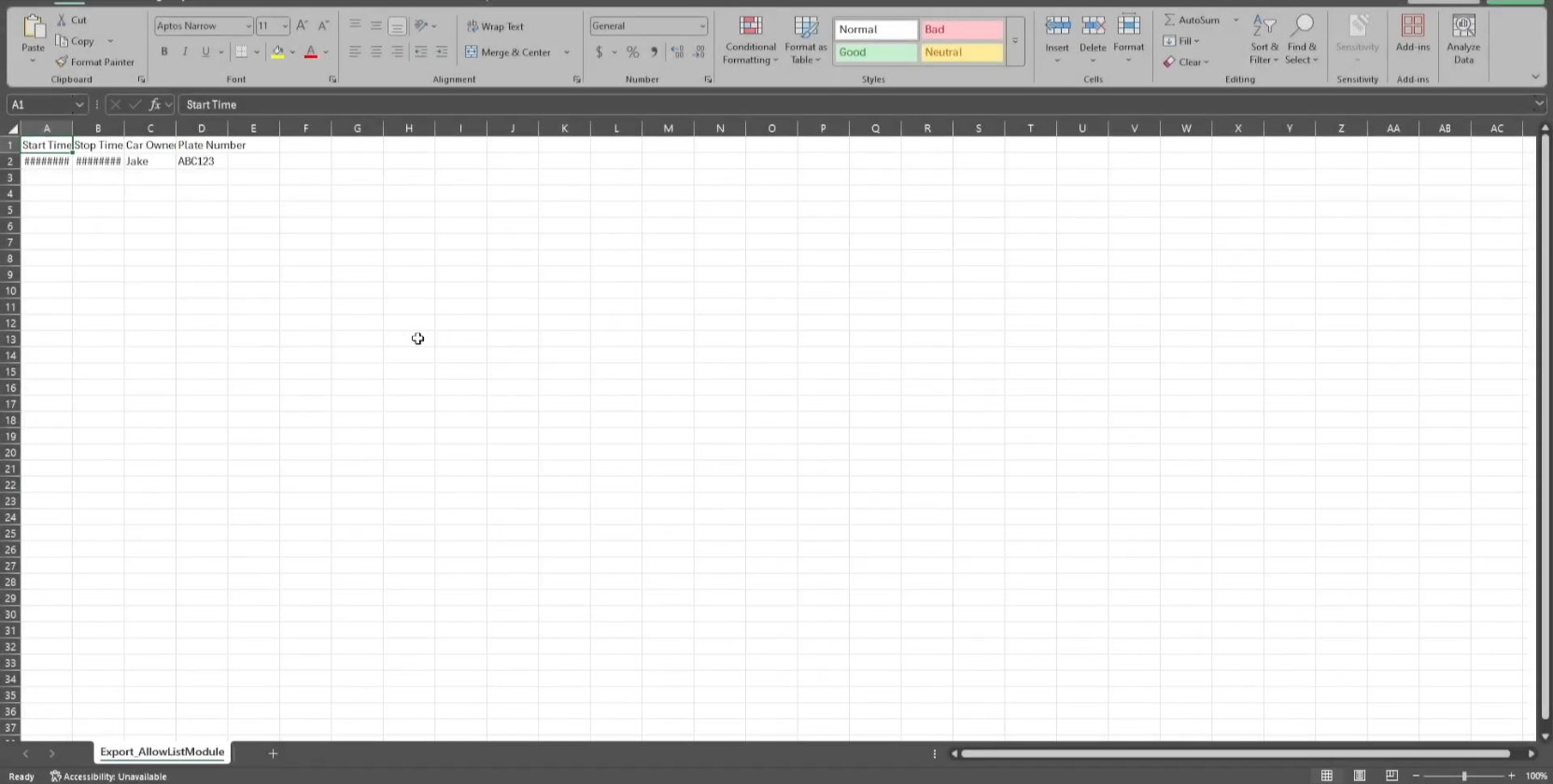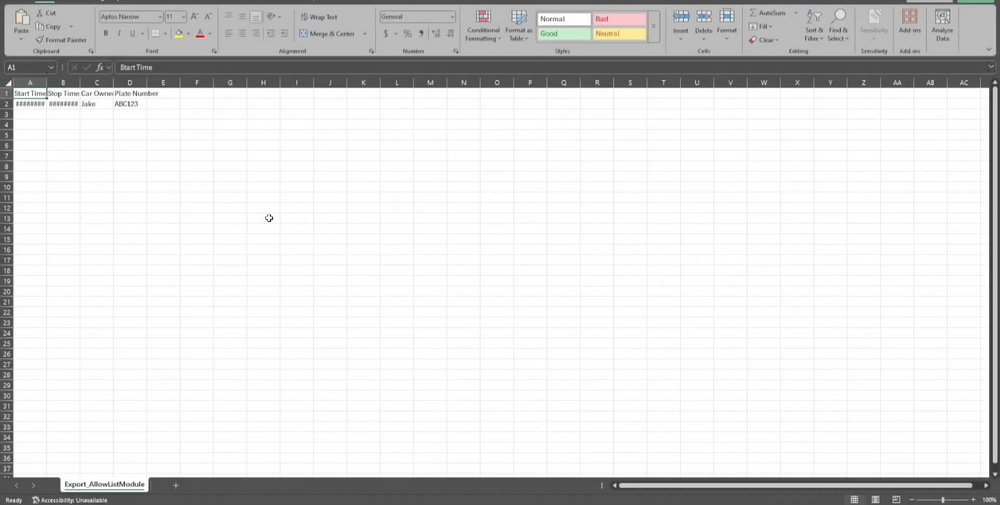 5. The sample Excel sheet provided allows for the addition of multiple license plates. Modify the Plate Number, Start Time, End Time, and Owner Name fields as needed.