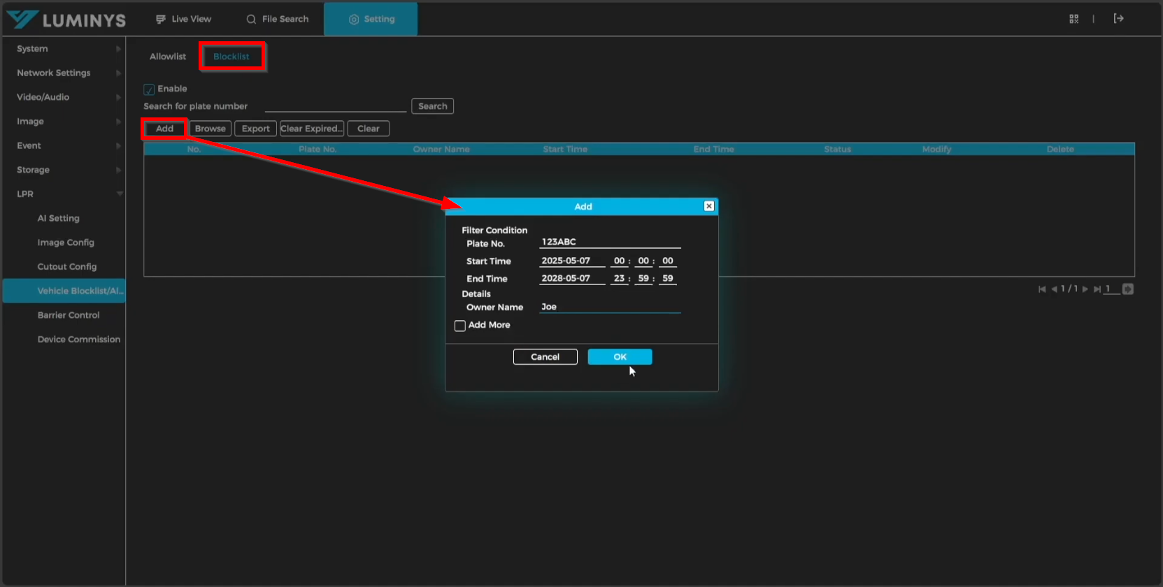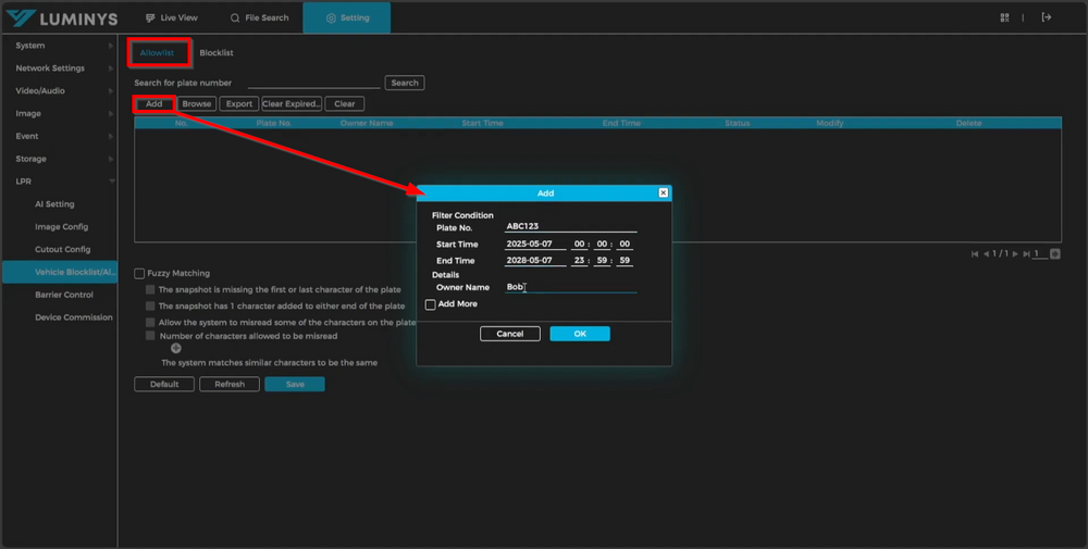 2. To add license plates to the allowlist, select Add. A pop-up window will appear, allowing entry of the Plate No., Start Time, End Time (expiration time), and Owner Name. To add multiple license plates consecutively, enable the Add More checkbox.