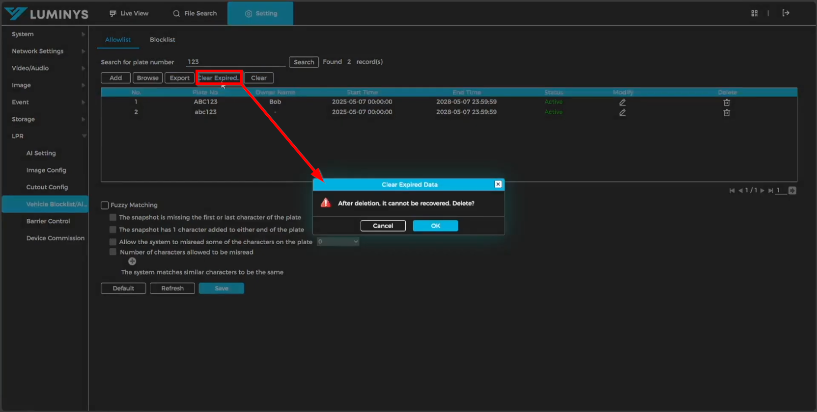 8. To remove all expired vehicles from the allowlist, select the Clear Expired Data button.
