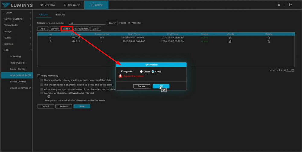 7. To export the current allowlist, use the Export option. This will download an Excel file containing all previously added license plates. File encryption can be enabled or disabled as desired during the export process.