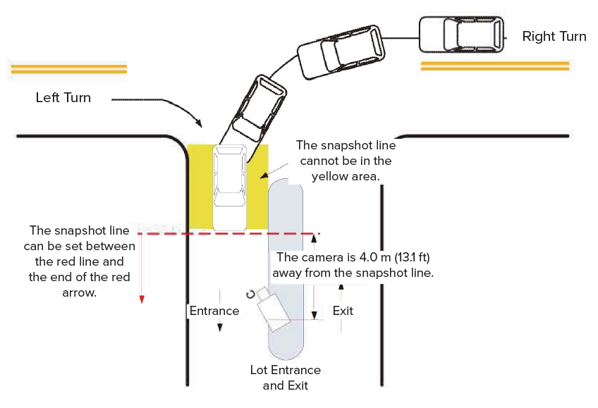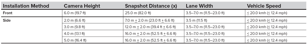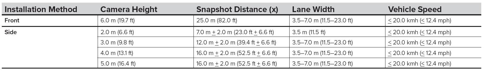 For the best results, it is recommended to install the camera at a height of 1.2 m (3.9 ft). The lane width should not exceed 3.5 m (11.5 ft). If the lane is too wide, place guides on the lane to direct vehicle traffic. The camera will capture a snapshot from 4.0 m (13.1 ft) away.