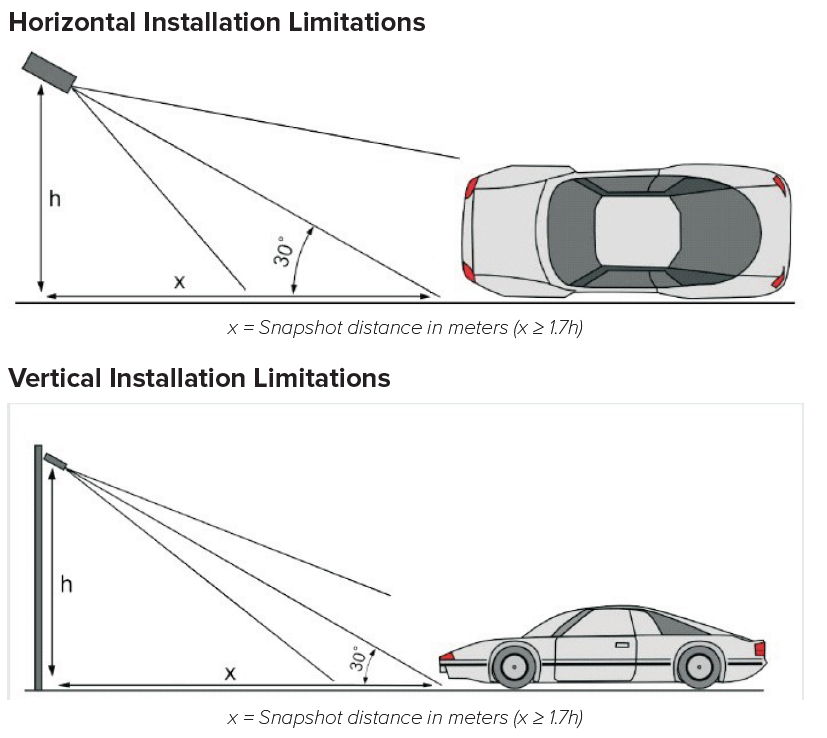 The angle between camera lens and the edge of the farthest lane cannot exceed 30° regardless if the camera is installed frontally or on the side. The camera will capture a snapshot up to 1.7 times the height between the placement of the camera and the edge of the farthest lane.