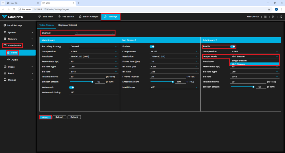4. Enable Sub Stream 2, and set the Output Mode to 4 in 1 Stream / LumiFlex 1 (depending on camera model).