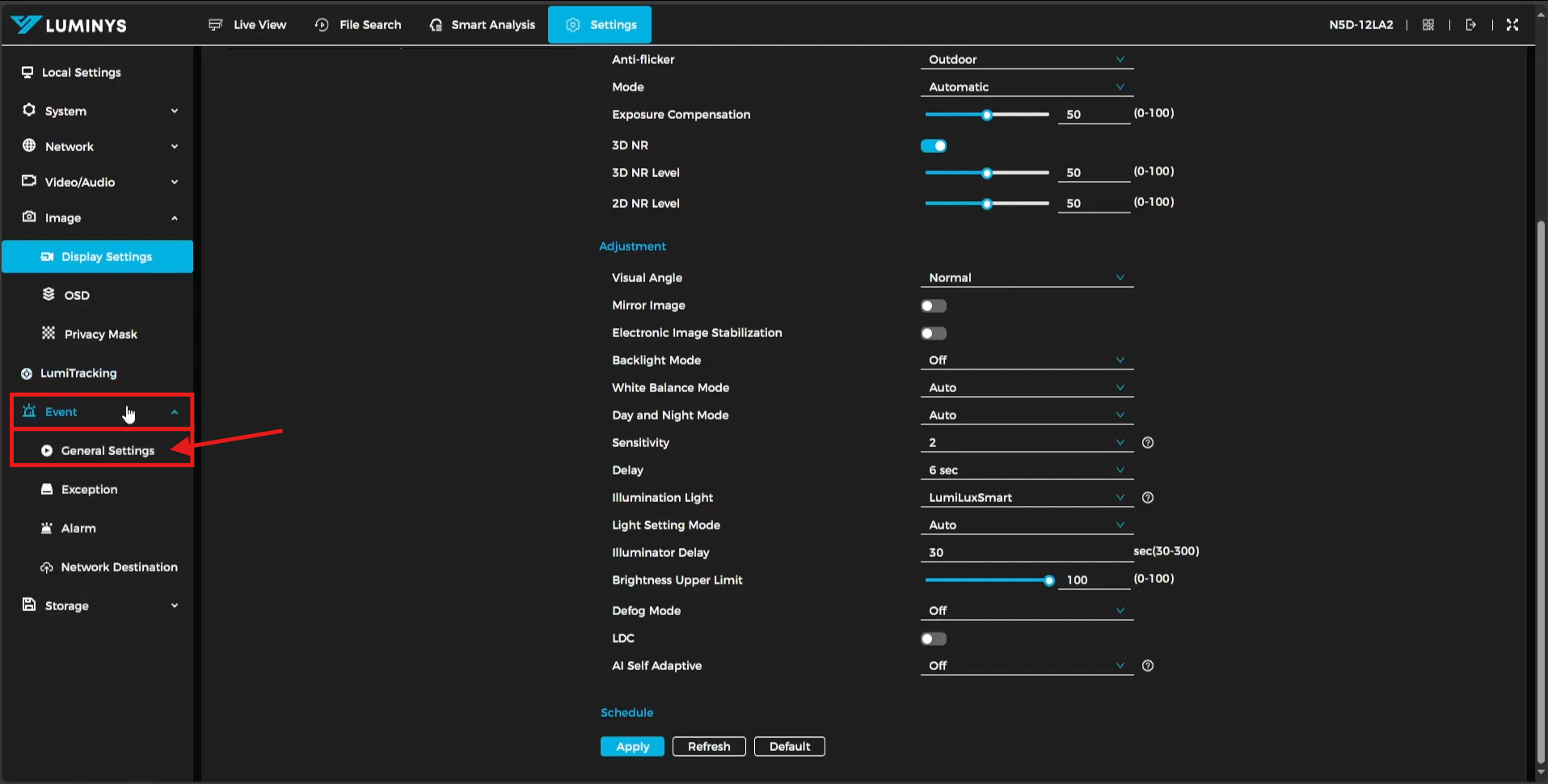 Next we either need to set up IMD or VCA to the camera can be aware to watch for “human targets”. For this document we will set up IMD. To do this, on the left expand the event section and then click on general settings.