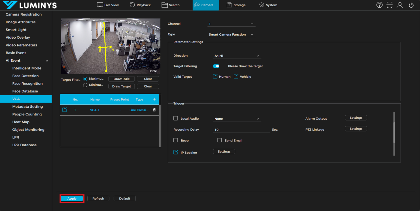 Left click on the live view to start drawing the rule. Keep left clicking to add more segments. Right click to complete drawing the rule.