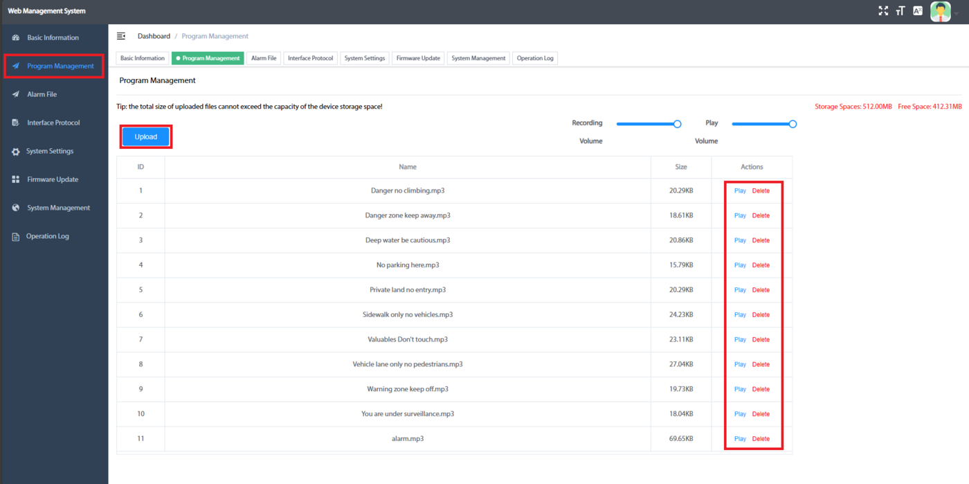 You can test play any of the existing audio files through the speaker by pressing the Play button next to any of them.