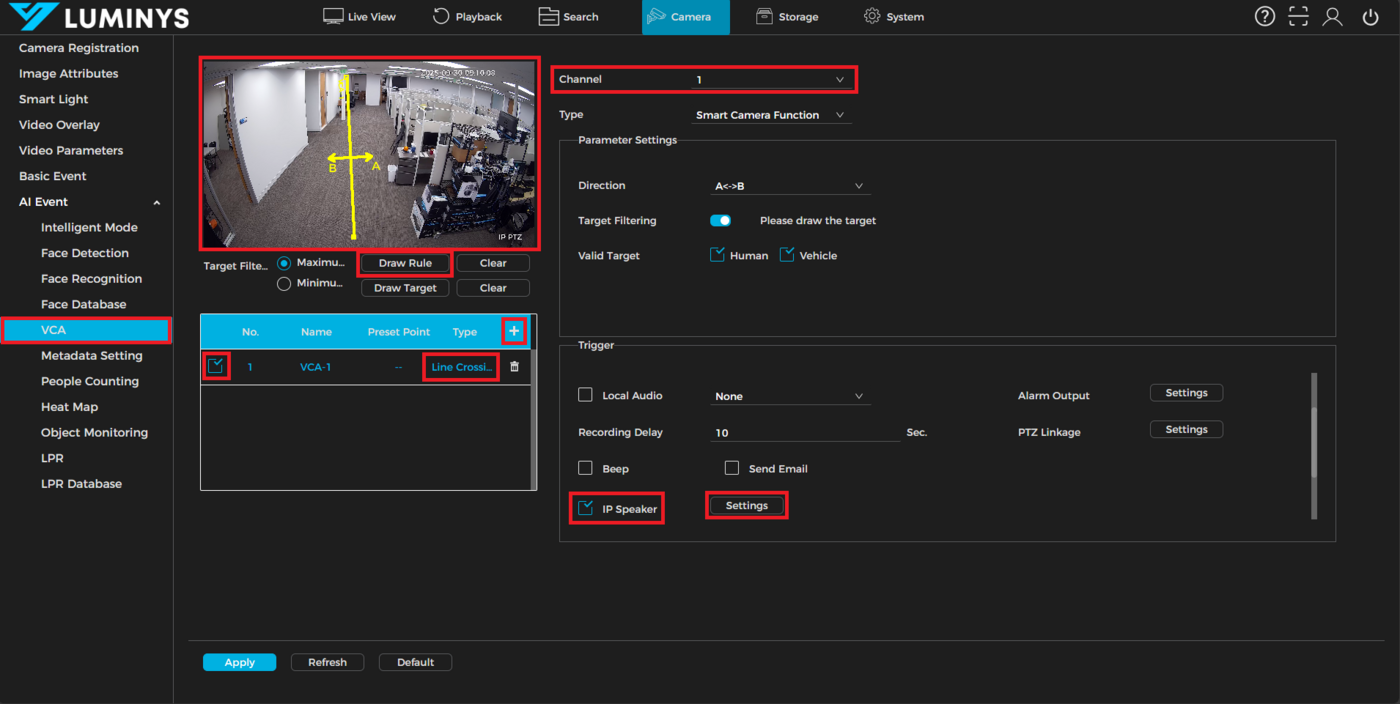 3. Click on a camera channel to highlight it and bind the IP Speaker to 2 Way Talk for that channel.