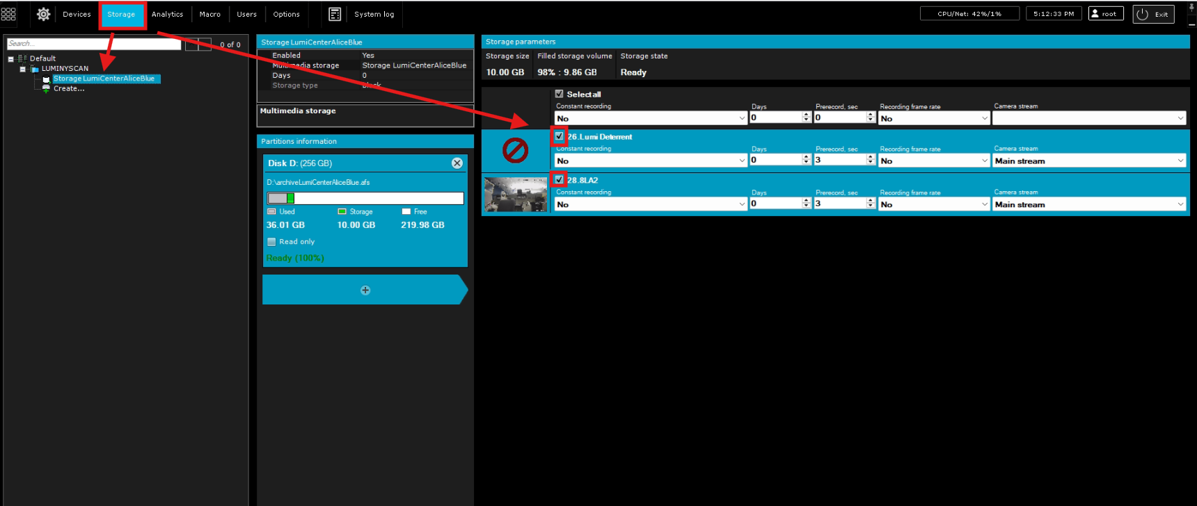 Once you have created the storage archive, the next step is to make sure the devices are setup to use the storage archive that you created. To do this you will need to be in the storage section of settings, once there you will first want to select the storage archive that you have created under the server tree. Once you have selected the storage archive you should see the devices on the right hand side. If the devices were added before the storage archive, the devices will not be highlighted blue and will not contain a check mark in the boxes. All you will need to do is put checks in the boxes beside the devices you have added. When adding the checks and saving you will now notice the devices have a blue highlight.