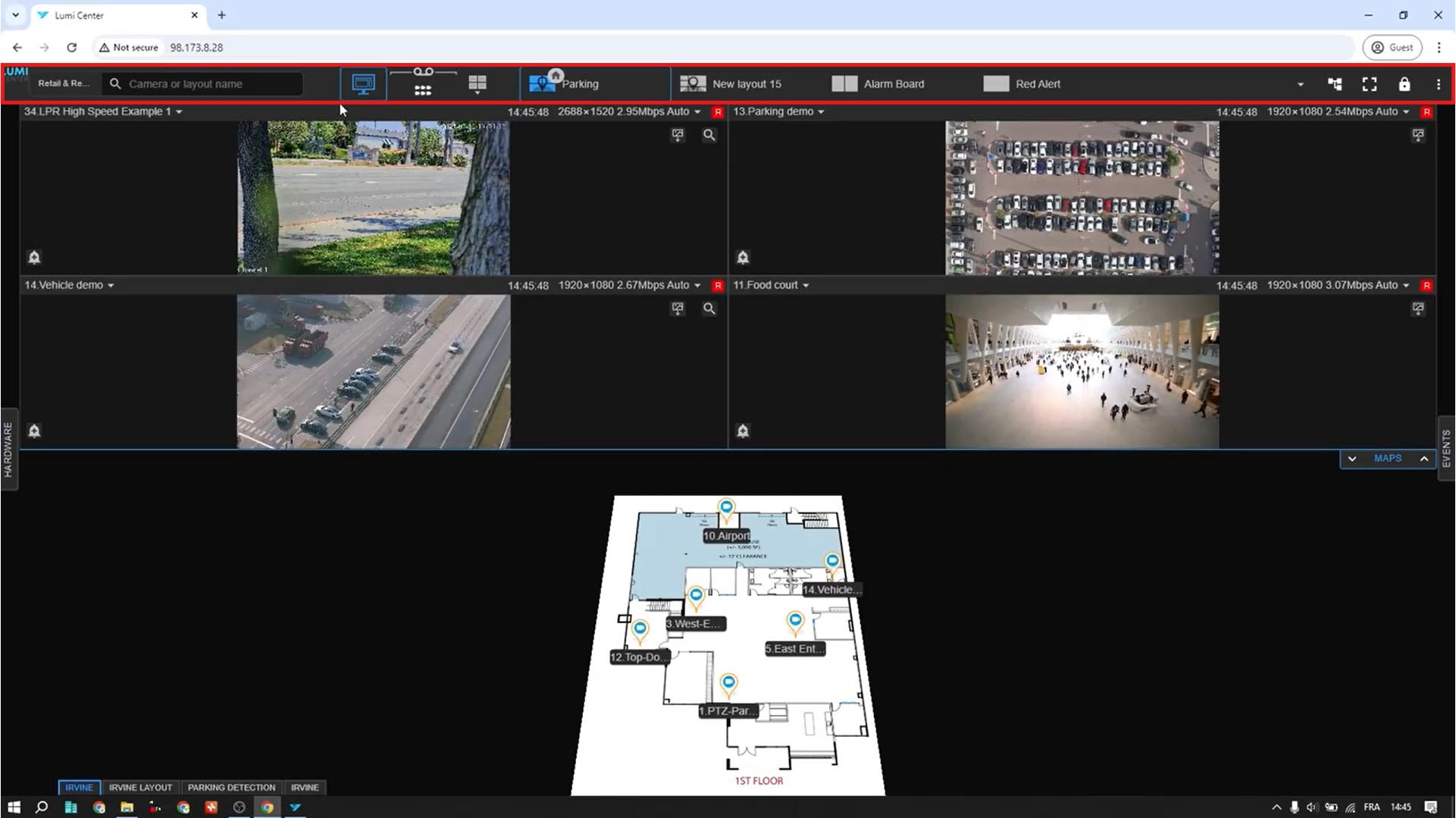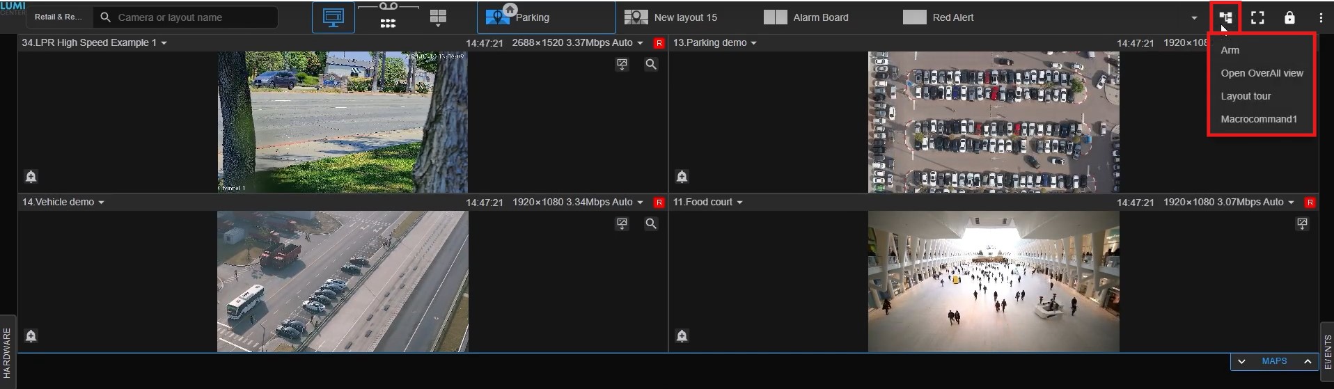 14. Next when you are back on the default page, you can click on the events button on the right. When you click on this it will expand to show you the list of recent events. If you click on the event it will bring up the playback of that event. You can use the playback controls in the bottom right to play, pause etc. This concludes are first look at the LumiCenter WebClient.