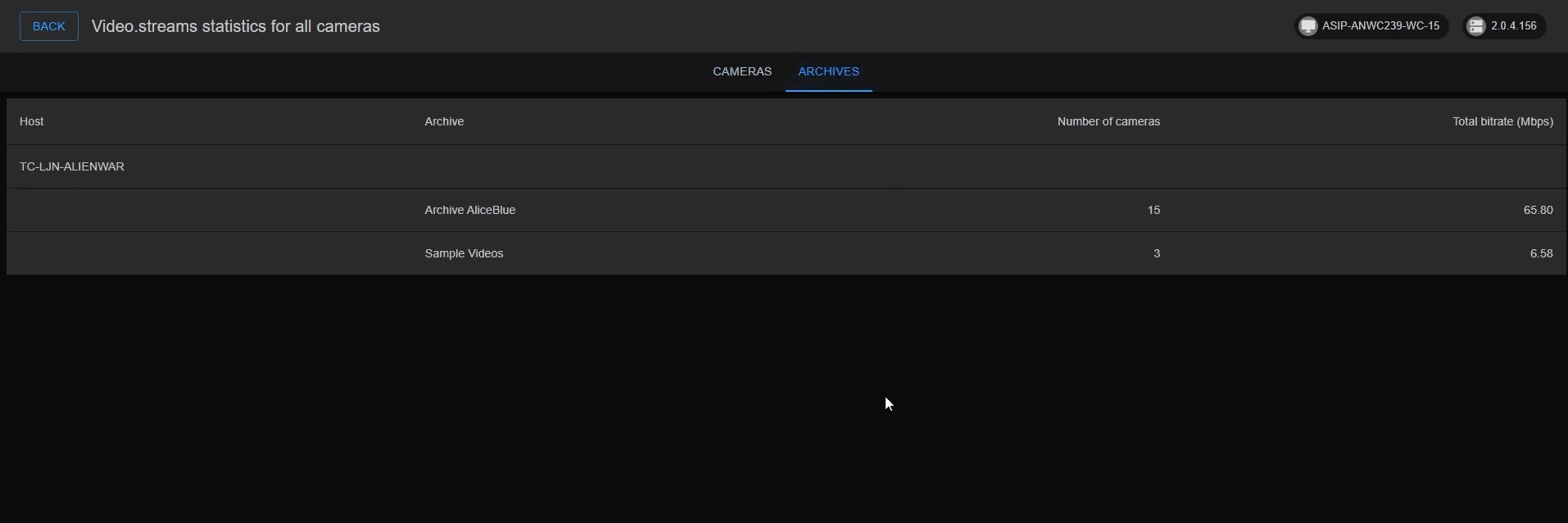 12. If you click on the archives option along the top of the statistics panel, it will show you the recording status of all the storage archives under the domain object. Click back in the top left to go back to the main interface of the LumiCenter Web Client.