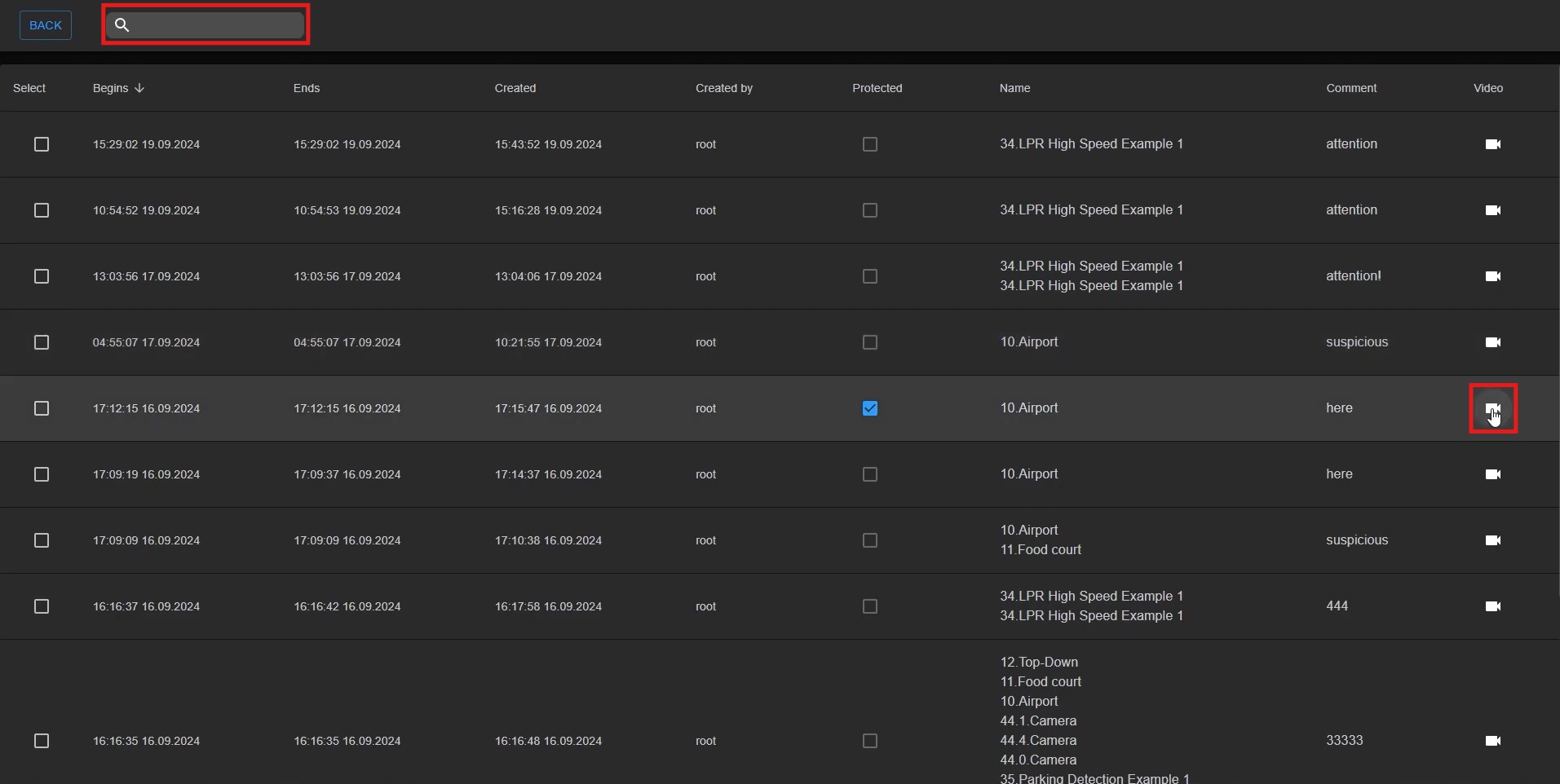 13. Last but not least, if you click on the archive bookmarks option, it will bring you to a list of all the comments that have been created in LumiCenter. If you click the video button to the right of the comment, it will jump to the timepoint in the storage archive to view the video clip. You can also use the search bar along the top to search for a comment. Clcik back to go back to the main interface of the LumiCenter Client.