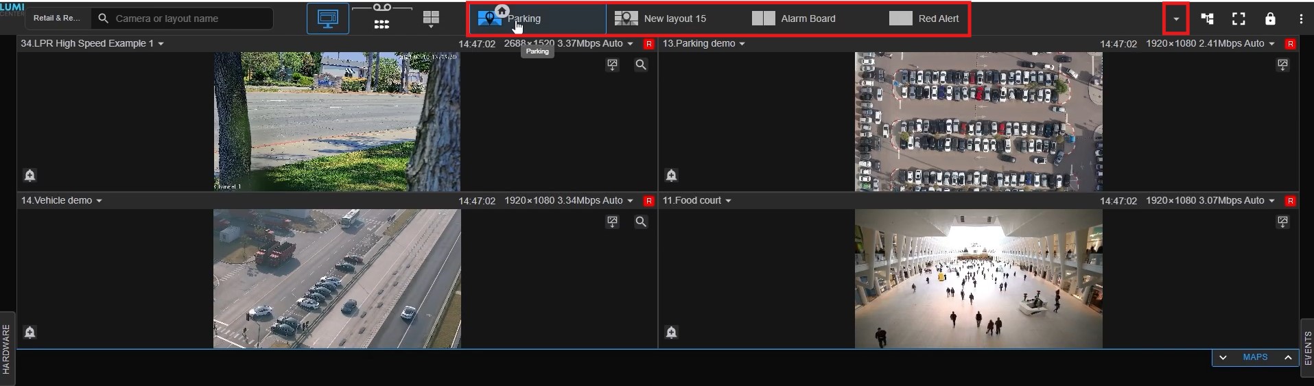 6. Next you will see all the layouts that you have once created on the desktop application. You can expand to see all of the layouts by clicking the drop down to the right. Click the button again to hide the layouts.
