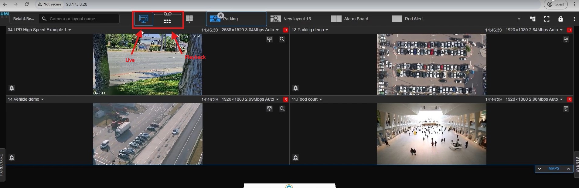 4. Next you have the most frequently used features for the web client which is live view and playback. By default the web client will show you the live view, if you want to do playback, click on the “multi camera archive” which I labelled in the picture as playback.