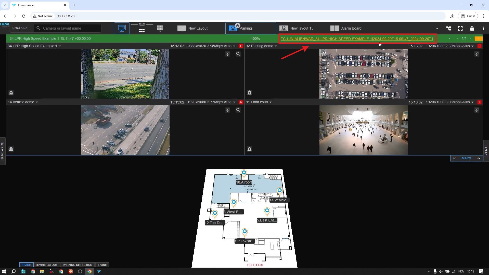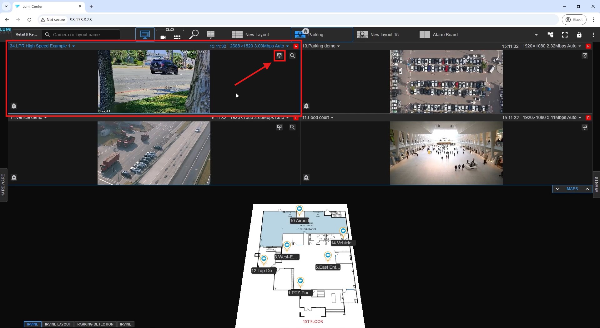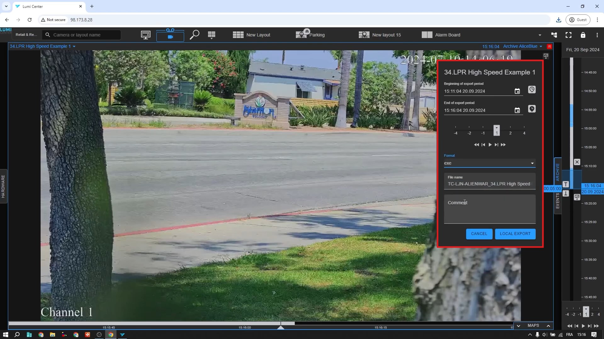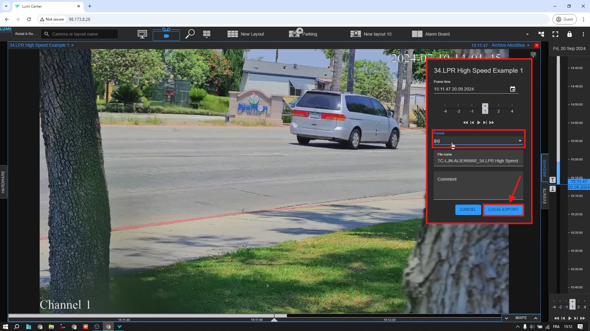 1. Today we will be learning how to export a picture or video clip from the LumiCenter WebClient. To start you will want to be in the LumiCenter webclient, then you will want to select the video stream that you want to export from. Then you will click on the local export button in the top right of the video window as highlighted in my picture.