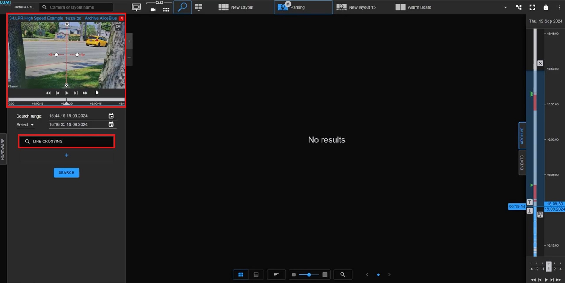 8. Another option is to choose from the other sub detection tools such as line crossing. When choosing this option, it will add a line onto the live view which is what it will be using to search for. Anything that has crossed that line will show up in the event search. You can also adjust that line using your mouse to capture a specific spot. After clicking search you will see the results, then you can click on one of the results to jump to that specific time and then you can use the playback controls to play/pause etc. This step concludes how to search for events within LumiCenter WebClient.