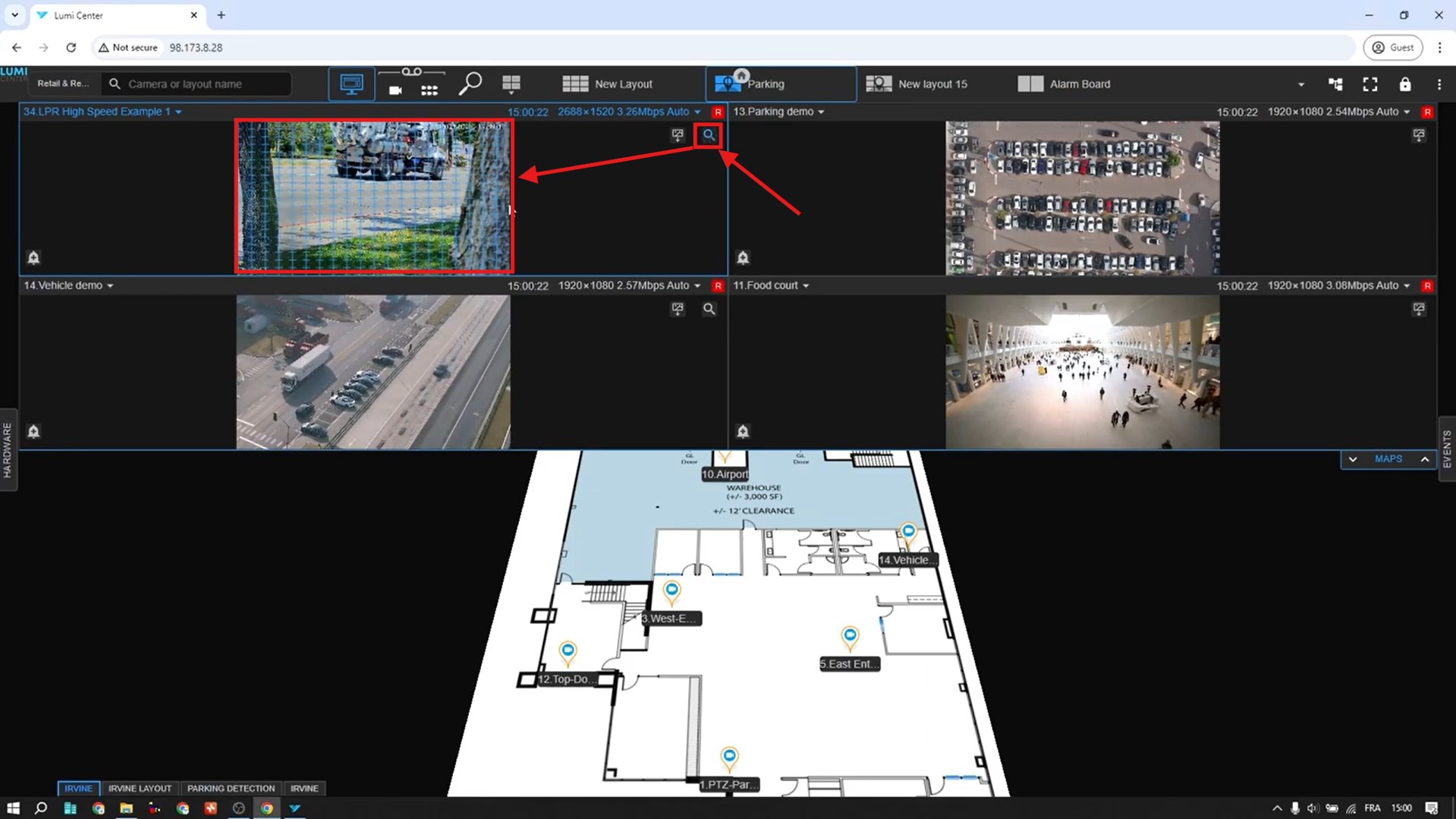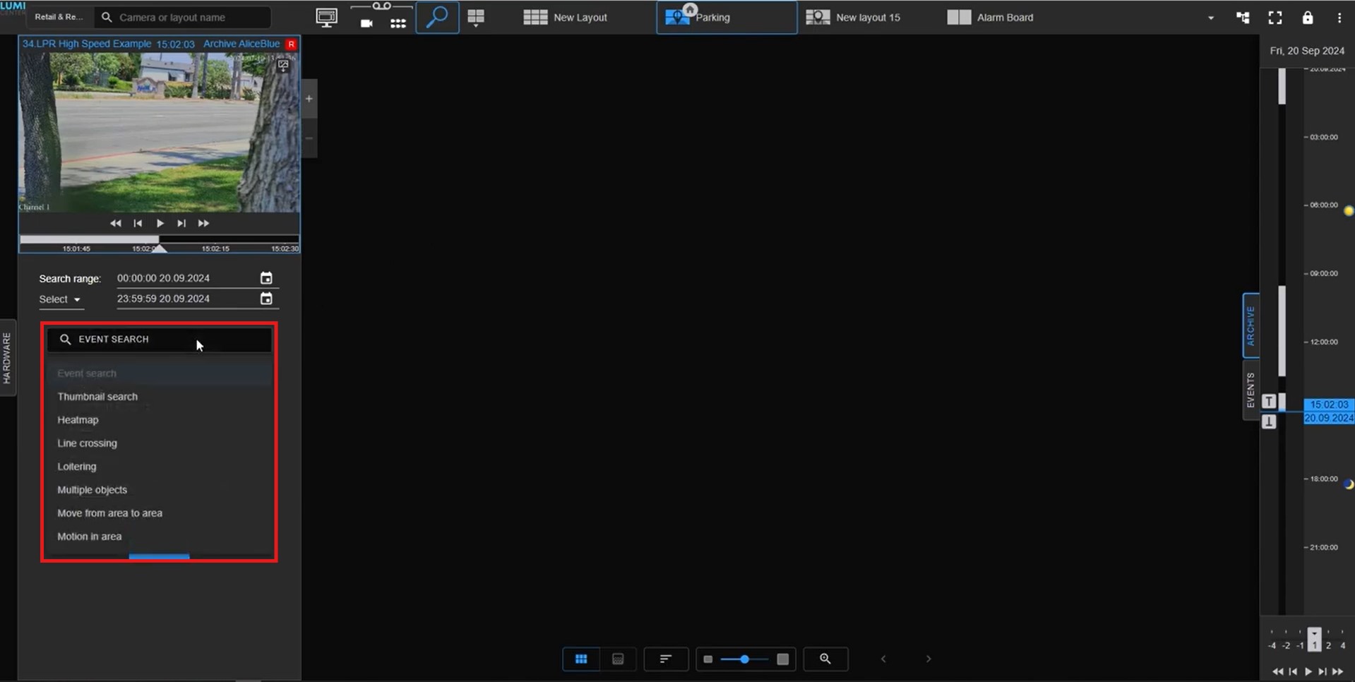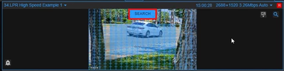 1. In this document we will learn how to do event searches from within the LumiCenter Web Client. It is important to note that you cannot configure detection tools within the WebClient, you will need to do that through the desktop client, however you can search for the results within the WebClient. The first way to do an event search is to use the fast search option. To do this, you will see a magnifying glass inside the camera view, if you click on that option it will bring up a grid on the live view. Once the grid is there, you can use the mouse to draw an area to search, you can see that it will highlight the area blue. Once you have drawn your box you can click the search bar that will appear.