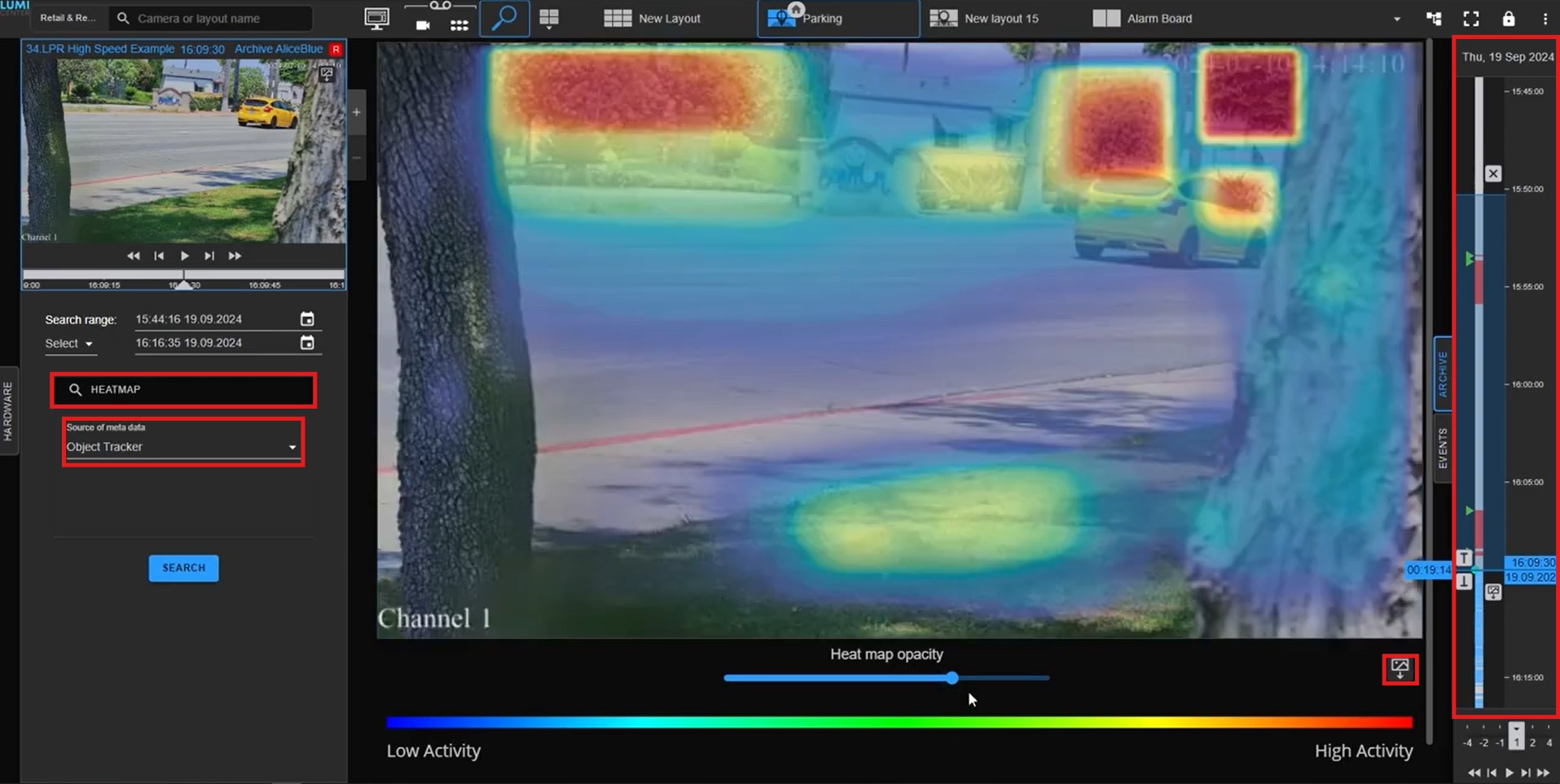 7. We can also do a heatmap search, this requires a data source, so in this case we will use the object tracker to pull the data from. You will also want to set a search range on the ride hand side within the timeline bar. After clicking search you will see the heatmap on the playback. You can also choose the opacity of the heatmap underneath the playback. You can also export a picture of the heatmap by clicking the save image button in the bottom right.