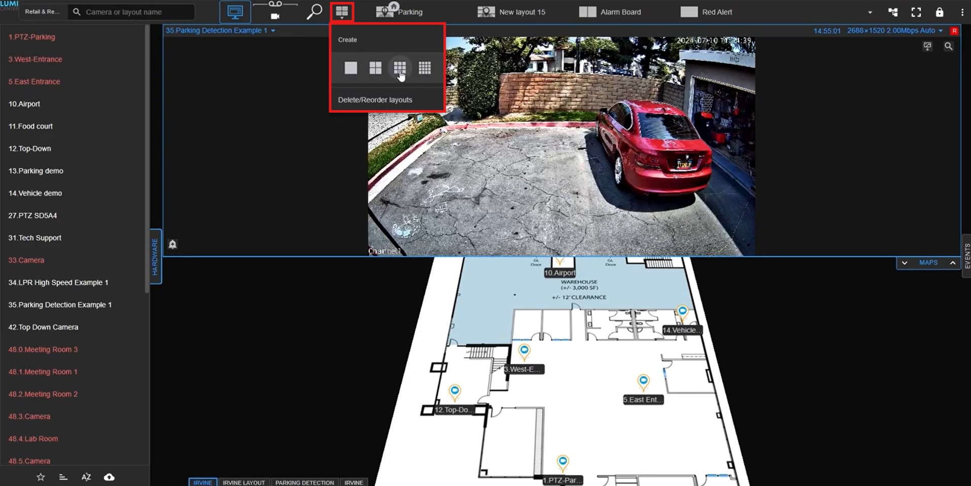 4. You can also create new layouts within the LumiCenter Web Client. To do so, click on the layout editing mode button which I have highlighted in the picture, and then choose the layout type that you want to create. For this we will select the 3 x 3 mode. The WebClient will automatically fill in the first 9 cameras that are online into the 9 camera view window. You can also swap out whatever cameras you want for other cameras if you wish. Once you have the correct cameras added, you can click save, to save the layout.