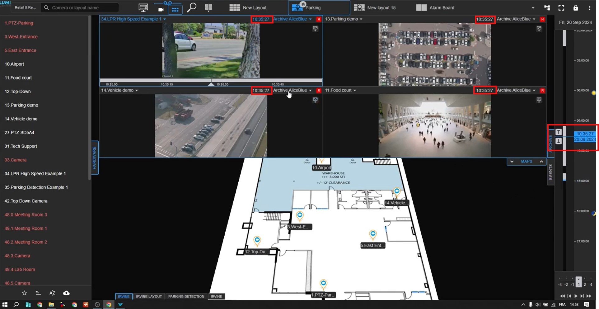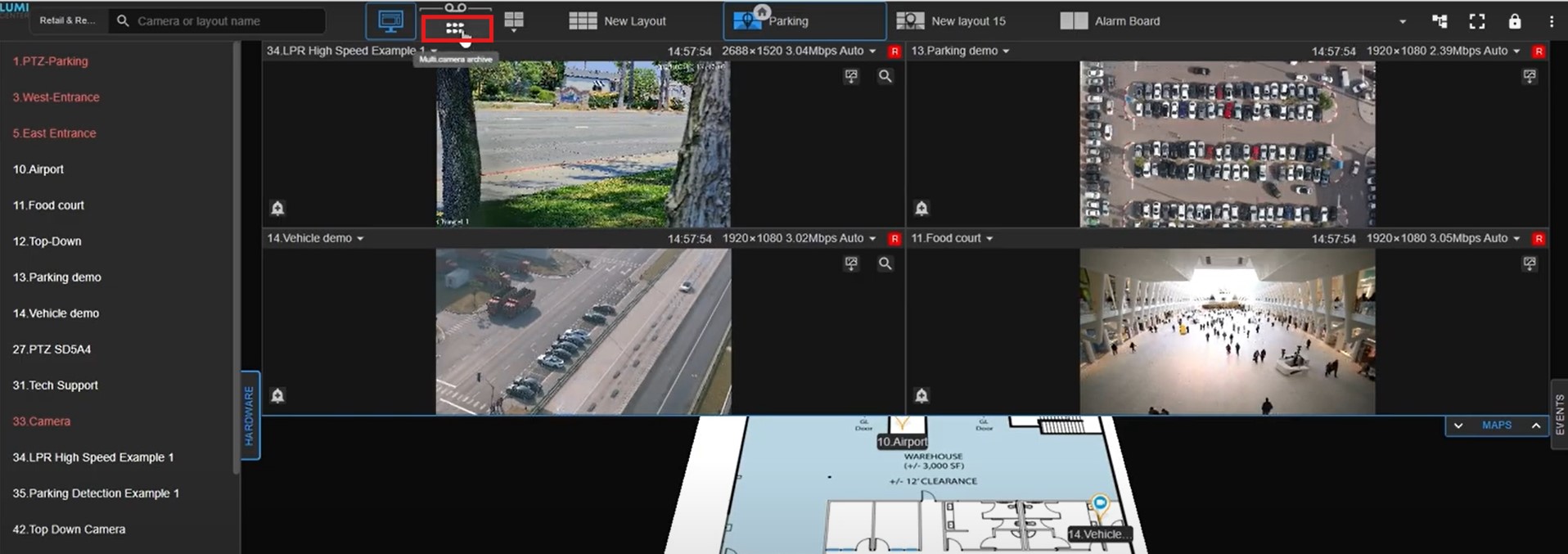 6. The other option in playback is to have the WebClient playback all of the cameras in the current layout. To do this you will click on the “multi camera archive” at the top which I have highlighted. This will pull all of the cameras into playback mode. Now you will notice when you select a time on the timeline bar, that all of the cameras have switched their time to the same time. Now when you click play in the bottom right, all of the cameras will play simultaneously from the same time.