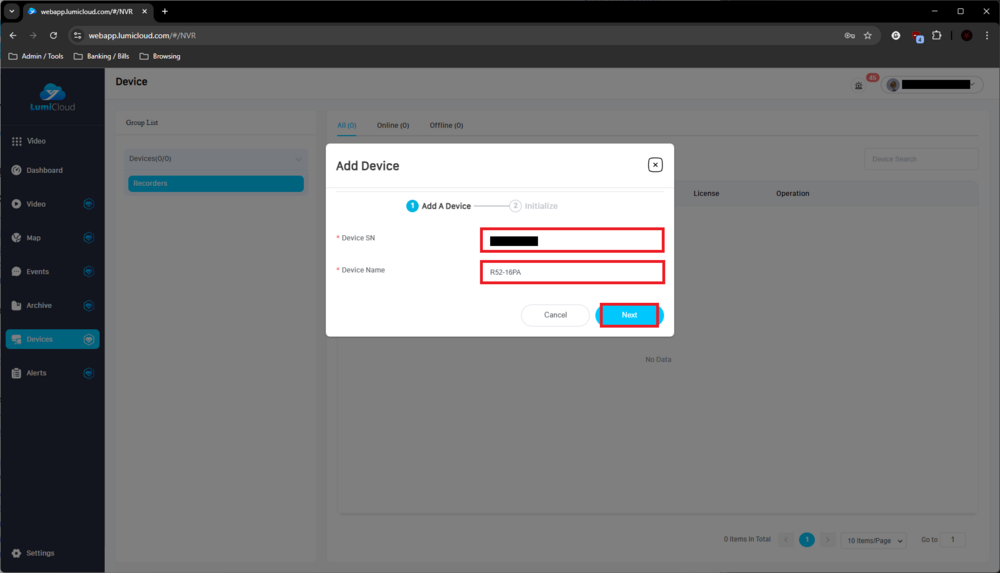 3. Enter the serial number for the device you are adding, and provide a name to help recognize which device it is. Click Next to continue the process.