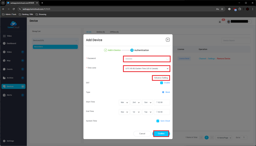4. Enter the password for the admin account and select the appropriate time zone. Be sure to click the Advanced Settings button to configure DST if required. Failure to set DST can result in playback issues. Click Confirm when you are finished.