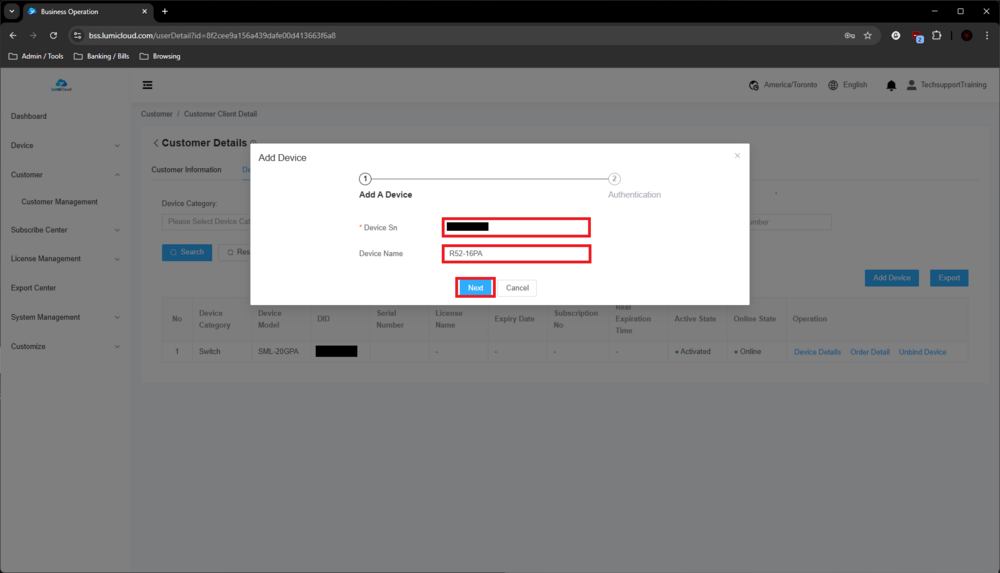 4. Enter the devices serial number, provide a name to help identify the device, and click Next.
