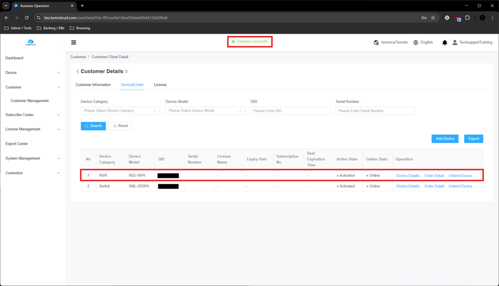6. The Confirm button will show a loading icon for a moment. Once it is finished adding you will see an Operation successful message at the top of the window. You will also see the device is now available in the list for this user.