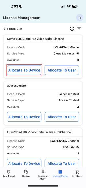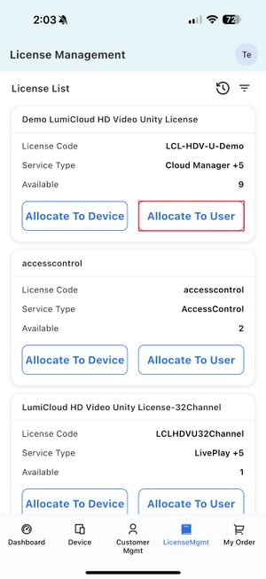 1. Open up the LumiPartner app and log in. Once logged in, select the LicenseMgmt tab at the bottom. Locate the license you wish to assign, and select Allocate to User.