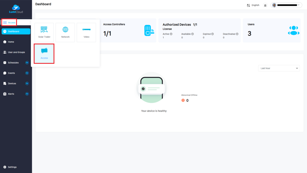 1. Start by logging in to your LumiCloud account at https://webapp.lumicloud.com and select Access from the Device Type menu.