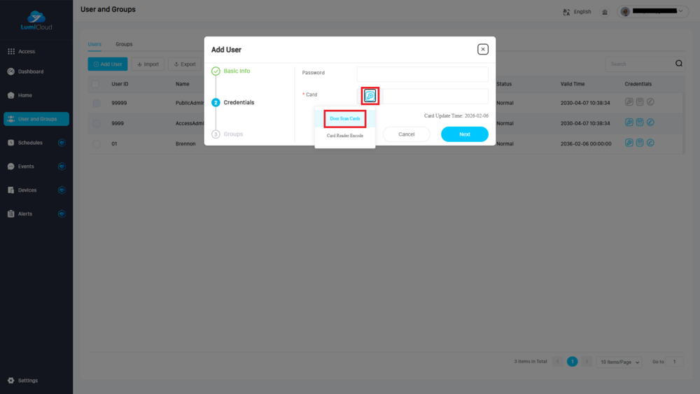 4. To register a card to the user, click the button beside Card, and select the reader type you wish to use to register with. Door Scan Card will use a reader attached to the controller to register the card, and Card Reader Encode will use a USB card Issuer if you have one connected to your computer.